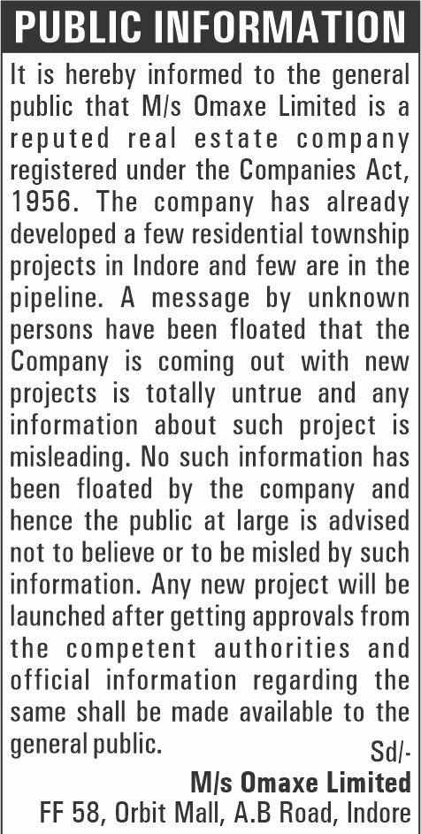 इसी बीच एक फ़र्जी विज्ञप्ति सोशल मीडिया पर चल रही है जो ओमैक्स लिमिटेड 58 ऑरबिट मॉल एबी रोड इंदौर के नाम से जारी हुई है। जिसमें जनता को सूचित किया गया है कि मेसर्स ओमैक्स लिमिटेड कंपनी अधिनियम 1956 के अंतर्गत एक प्रतिष्ठित रियल इस्टेट कंपनी है जिसने इंदौर में पहले ही कुछ आवासीय टाउनशिप विकसित की हैं। अज्ञात व्यक्ति द्वारा सन्देश भेजा गया है कि कंपनी नई परियोजना के साथ आ रही है जो पूरी तरह से असत्य और भ्रामक है । कंपनी द्वारा ऐसी जानकारी जारी नहीं की गई है। इसलिए जनता को ये सलाह दी जाती है कि इस पर गुमराह हुए बग़ैर विश्वास ना करे। किसी भी नई योजना को सक्षम अधिकारियों से अनुमोदन प्राप्त करके ही शुरू किया जाएगा और इसके बारे में अधिकृत जानकारी आमजन को उपलब्ध करवाई जाएगी…. एम डी मेसर्स ओमैक्स लिमिटेड।