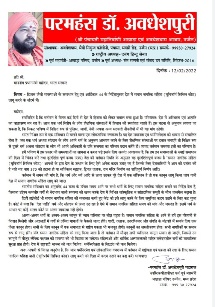 हिजाब के लिए बबाल जैसी समस्याओं का यही है समाधान डॉ अवधेशपुरी महाराज ने लिखा प्रधानमंत्री को पत्र उज्जैन,बाबा महाकाल की धार्मिक एवं ऐतिहासिक नगरी उज्जैन के क्रांतिकारी संत डॉ अवधेशपुरी महाराज ने प्रधानमंत्री माननीय नरेंद्र मोदी जी को पत्र लिखकर अनुरोध किया है , कि वर्तमान में देश में हिजाब को लेकर बबाल मचा हुआ है । आज हिजाब को लेकर शिक्षण संस्थानों पर दबाव बनाया जा रहा है तो निकट भविष्य में निश्चित रूप से पुलिस , आर्मी , नेवी एवं अन्य सरकारी नौकरियों में भी यह दबाव बनाया जाएगा । अतः हिजाब जैसी अनेक समस्याओं के समाधान के लिए तथा भारत जैसे लोकतांत्रिक गणराज्य में वर्ग आदि से ऊपर उठ कर पूरे देश में एक कानून लागू करने केलिए समान नागरिक संहिता ( यूनीफॉर्म सिविल कोड ) लागू करने का उचित समय है । जिस प्रकार देश ने धारा 370 हटाना , ट्रिपल तलाक , सर्जिकल स्ट्राइक एवं श्री राम मंदिर के निर्माण के उचित निर्णय की प्रशंसा करते हुए सहर्ष स्वीकार किया है तो समान नागरिक संहिता लागू करने के निर्णय को भी देशहर शिकार करने के लिए तैयार है । भारतीय संविधान का अनुच्छेद 44 राज्य को उचित समय आने पर सभी धर्मों के लिए समान नागरिक संहिता बनाने का निर्देश देता है । दिल्ली हाईकोर्ट भी समान नागरिक संहिता की वकालत करते हुए केंद्र को इसे लागू करने के लिए समुचित कदम उठाने के लिए कह चुका है । कोर्ट ने कहा था कि ” देश जाति , धर्म और समुदाय से ऊपर उठ रहा है ,ऐसे में समान नागरिक संहिता समय की मांग और जरूरत है । क्या होंगे लाभ ? न्यायपालिका पर पड़ रहा भार कम होगा । परिणामः देश में करीब एक करोड़ लंबित प्रकरणों को निराकरण में शीघ्रता आएगी । शादी , तलाक , सम्पत्ति व उत्तराधिकार में सबके लिए एक जैसा कानून होगा । सभी के लिए कानून में समानता आने से राष्ट्रीय एकता मजबूत होगी । कानूनों का सरलीकरण होगा तथा सभी नागरिकों पर समानता से लागू होंगे । सभी व्यक्तिगत कानून समान रूप से लागू होने पर नागरिकों को लैंगिक न्याय भी प्राप्त होगा । महिलाओं और धार्मिक अल्पसंख्यकों सहित संवेदनशील वर्गों को सामाजिक सुरक्षा प्राप्त होगी । धर्मनिरपेक्षता के सिद्धांत को बल मिलेगा ।