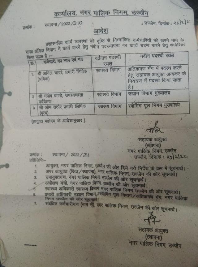 उज्जैन, नगर निगम के अधिकारी एवं कर्मचारी नगर निगम के आला अधिकारियों के आदेश की खुलेआम धज्जियां उड़ाते हुए नजर आ रहे हैं आलम यह है कि निगम के सहायक आयुक्त द्वारा फरवरी 2022 में जिस निगम कर्मी को स्वास्थ्य विभाग से हटाकर अतिक्रमण गेम मैं ट्रांसफर किया था लेकिन मई 2022 के खत्म होने के बाद भी अर्थात करीब 3 महीने बाद भी निगम कर्मचारी निगम के आला अधिकारियों के आदेश की अवहेलना करते हुए ट्रांसफर किए हुए विभाग में ज्वाइन नहीं करते हैं।