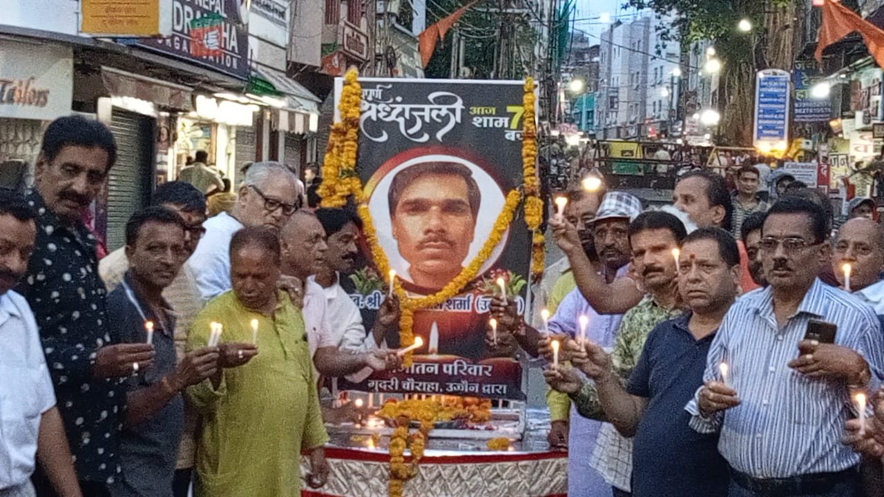 उज्जैन,उदयपुर के बलिदानी कन्हैया लाल टेलर को आज सनातन परिवार गुदरी चौराहा उज्जैन द्वारा सैकड़ों की संख्या में उपस्थित राष्ट्र भक्तों ने मोमबत्ती दीप प्रज्वलन कर श्रद्धांजलि अर्पित कर जेहादी आतंकवादियों की कड़ी निंदा कर राष्ट्रभक्ति के नारे बुलंद किए इस अवसर पर संस्था के प्रताप सिंह हाडा अखिल भारतीय ब्राह्मण समाज अध्यक्ष पंडित सुरेंद्र चतुर्वेदी प्रहलाद यादव वरिष्ठ अभिभाषक जिया लाल शर्मा चंदू पहलवान विनय ओझा शैलेंद्र द्विवेदी रविंद्र भारद्वाज अनिल मोढ बबल कप्तान वसंतराव अवार्ड आनंद भोज विकास खंडेलवाल अंकुर गर्ग अर्पित सेन गोवर्धन राठौर दीपक शर्मा दीपक कसेरा आनंद मोड़ जितेंद्र जैन अरुण शर्मा दीपक शर्मा सहित बड़ी संख्या में कार्यकर्ता उपस्थित थे।