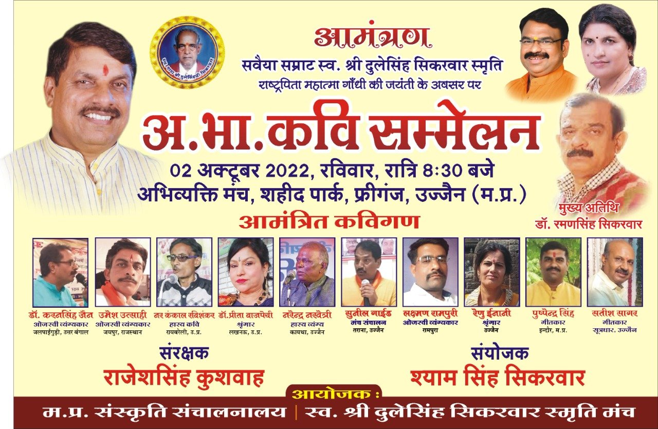 उज्जैन सवैया सम्राट स्वर्गीय दूले सिंह सिकरवार स्मृति, राष्ट्रपिता महात्मा गांधी जी की जयंती के अवसर पर प्रतिवर्षानुसार अखिल भारतीय कवि सम्मेलन 2 अक्टूबर 2022 रविवार को स्थानीय अभिव्यक्ति मंच शहिद पार्क पर आयोजित किया गया है।