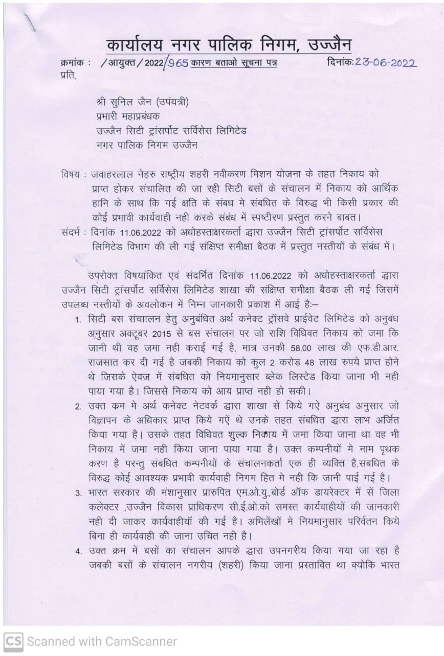 आपको बता दें कि नगर निगम की सिटी बसों का संचालन एवं संधारण करने की जिम्मेदारी मुख्य रूप से तीन अधिकारियों सुनील जैन , प्रभारी महाप्रबंधक उज्जैन सिटी ट्रांसपोर्ट सर्विस लिमिटेड नगर निगम , विजय गोयल , प्रभारी उप महाप्रबंधक उज्जैन सिटी ट्रांसपोर्ट सर्विस लिमिटेड नगर निगम, पवन कुमार लोढ़ा, प्रभारी सहायक महाप्रबंधक उज्जैन सिटी ट्रांसपोर्ट सर्विसेज लमिटेड नगर निगम को सौंपी गई थी, सिटी बस के संचालन और संधारण में कई अनियमितताएं उपरोक्त तीनों अधिकारी द्वारा की गई ऐसा पाया गया है जिसके चलते नगर निगम उज्जैन को करोड़ों रुपए की राजस्व हानि हुई ।