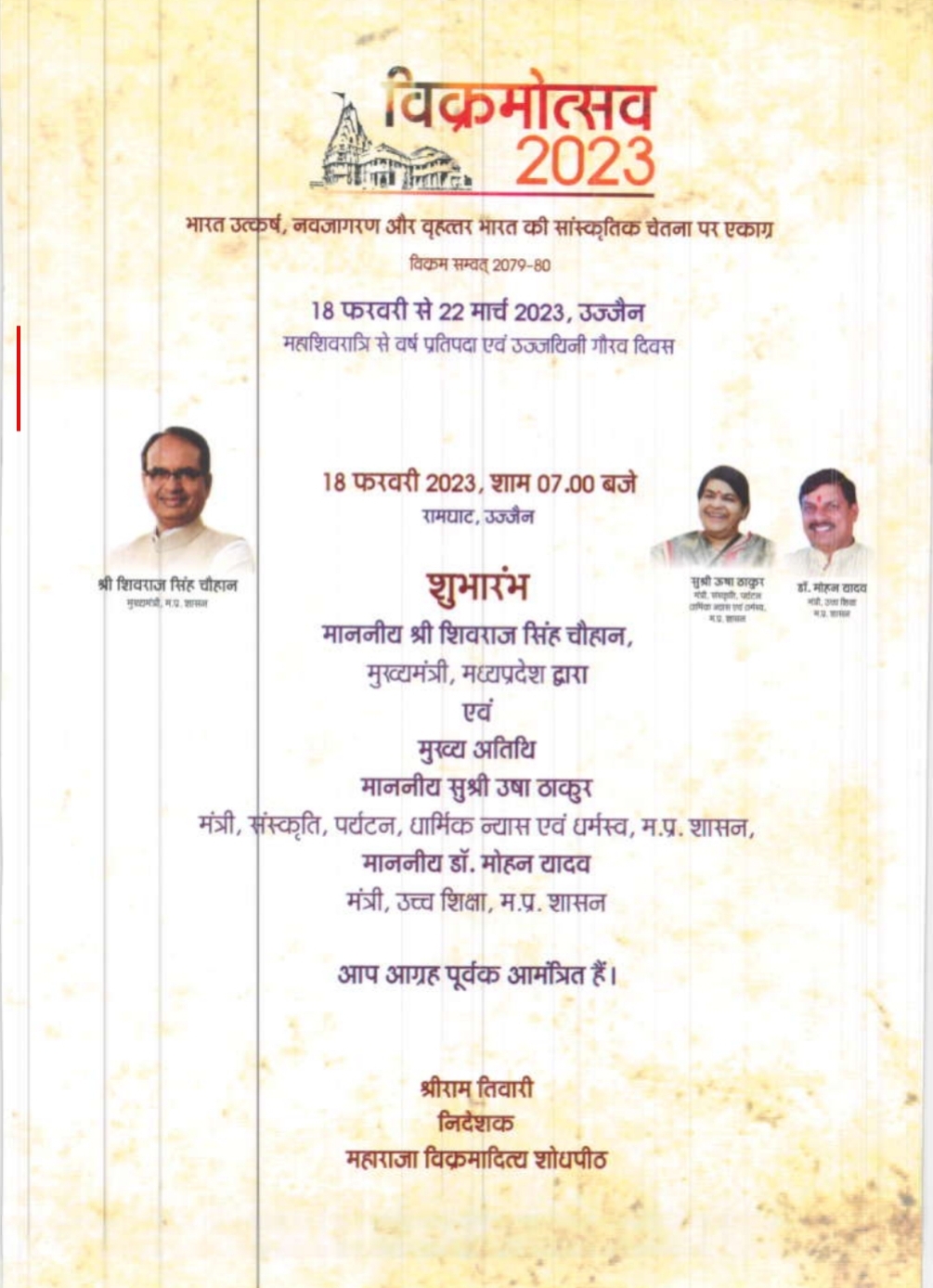 उज्जैन,(मनोजउपाध्याय) महाराजा विक्रमादित्य शोध पीठ,स्वराज संस्थान संचालनालय, संस्कृति विभाग मध्यप्रदेश शासन द्वारा विक्रमोत्सव 2023 का 33दिवसीय आयोजन किया जा रहा है, 33 दिवसीय इस कार्यक्रम का शुभारंभ 18 फरवरी को शिवरात्रि के मौके पर केवल शाब्दिक अर्थों में मोक्षदायिनी क्षिप्रा के तट पर 18 लाख से अधिक दीप जलाकर मध्य प्रदेश के मुख्यमंत्री शिवराज सिंह चौहान ने किया, उसके बाद 21 22 23 फरवरी को कुमार विश्वास के मुखारविंद से श्रीराम कथा का आयोजन किया गया, लेकिन शुरुआत से अब तक इस कार्यक्रम पर एक प्रश्न चिन्ह जरूर लग रहा है वह यह है कि जिस विभाग, स्वराज संस्थान संचालनालय, संस्कृति विभाग मध्यप्रदेश शासन के अंतर्गत इतना विशाल और इतने लंबे समय का कार्यक्रम हो रहा है , मध्य प्रदेश शासन के उस विभाग कि मंत्री सुश्री उषा ठाकुर लगभग 1 सप्ताह बीतने के बाद भी विक्रम उत्सव के किसी भी मंच पर उपस्थित नहीं हुई है यह एक बड़ा सवाल उत्पन्न कर रहा है की जिस विभाग द्वारा यह विक्रम उत्सव कराया जा रहा है उसके मंत्री कार्यक्रम की शुरुआत से अब तक नदारद हैं और कार्यक्रम का संचालन संधारण किसी अन्य मंत्रालय के मंत्री द्वारा किया जा रहा है।