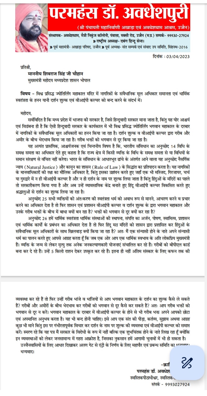 उज्जैन के स्वस्तिक पीठाधीश्वर परमहंस डॉ अवधेश पुरी महाराज ने प्रदेश के मुखिया से पत्र लिखकर गुजारिश की है कि विश्व प्रसिद्ध ज्योतिर्लिंग महाकाल मंदिर में नागरिकों के संवैधानिक मूल अधिकार समानता एवं धार्मिक स्वतंत्रता के हनन यानी दर्शन शुल्क एवं वीआईपी कल्चर को बन्द किया जाए , अपने पत्र में परमहंस डॉक्टर अवधेश पुरी महाराज ने लिखा है कि मध्य प्रदेश में भाजपा की सरकार है, जिसे हिन्दूवादी सरकार माना जाता है, किंतु यह घोर आश्चर्य एवं विडंबना ही है कि ऐसी हिन्दूवादी सरकार के कार्यकाल में भी विश्व प्रसिद्ध ज्योतिर्लिंग भगवान महाकाल के दरबार में नागरिकों के संवैधानिक मूल अधिकारों का हनन किया जा रहा है। दर्शन शुल्क व वीआईपी कल्चर द्वारा गरीब और अमीर के बीच भेदभाव किया जा रहा है। गरीब भक्तों को भगवान से दूर किया जा रहा है।